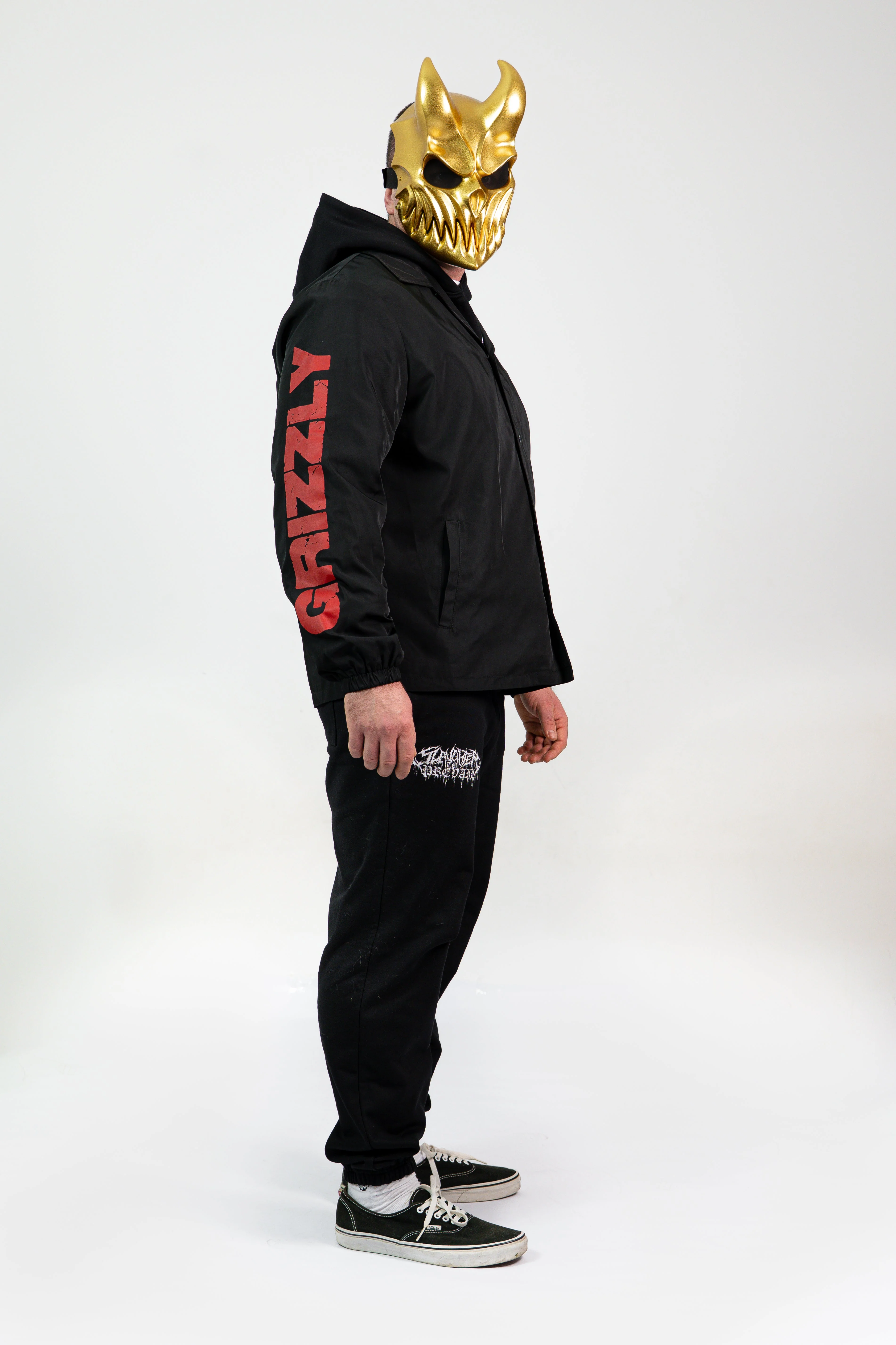 This coach jacket combines clean streetwear lines with full-blown deathcore aggression. The front keeps it sharp with a crisp STP logo, while the sleeves scream GRIZZLY in blood-red block lettering. Turn around and the entire back erupts with the colossal white demon mask, weathered like it’s carved into asphalt.